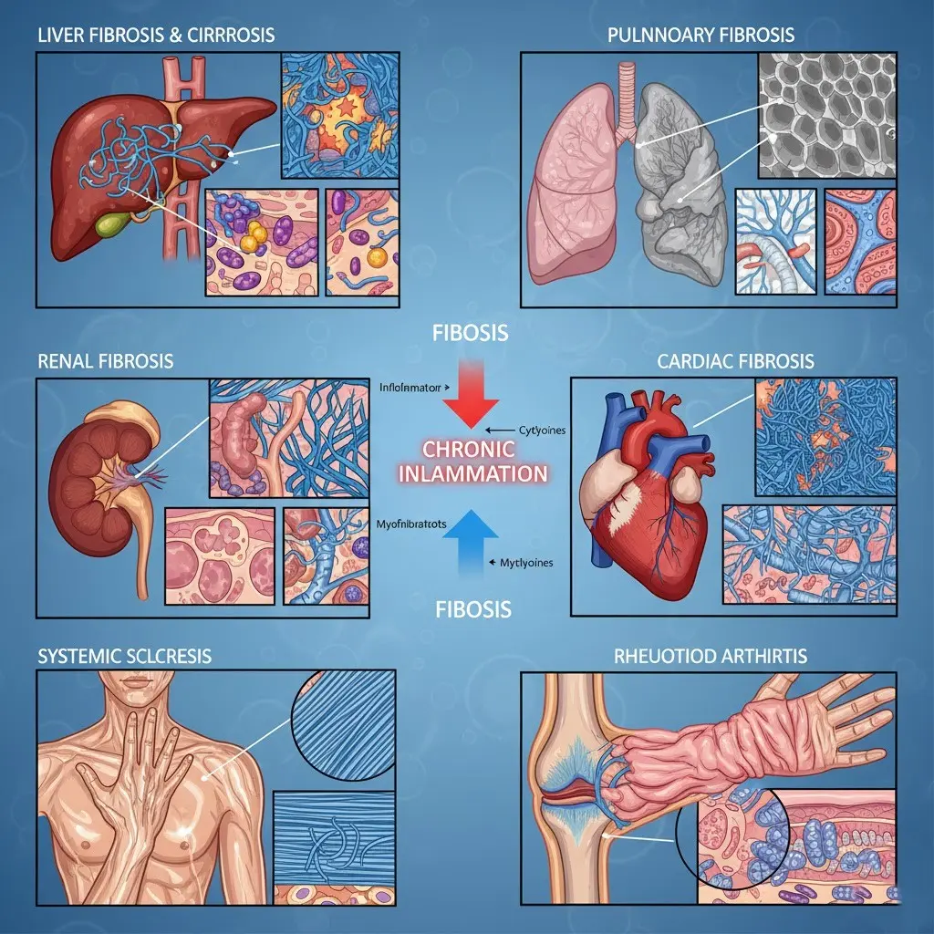 Fibrosis is the excessive accumulation of extracellular matrix (ECM) components, particularly collagen, as a result of prolonged tissue repair and scarring processes. When chronic inflammation continues unchecked, immune cells continuously release cytokines and growth factors like TGF-β, IL-6, and TNF-α. These molecules activate fibroblasts and myofibroblasts, promoting ECM deposition and ultimately leading to fibrosis.