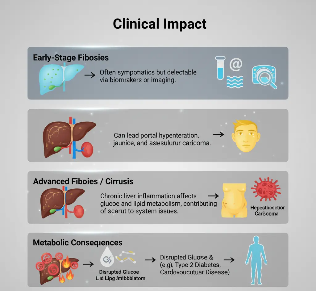 - Metabolic consequences: Chronic liver inflammation affects glucose and lipid metabolism, contributing to systemic